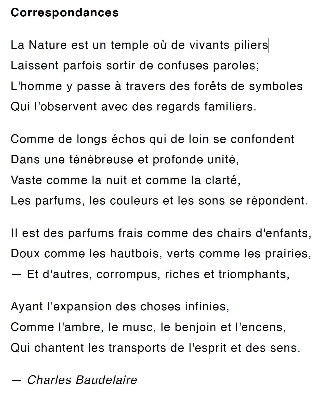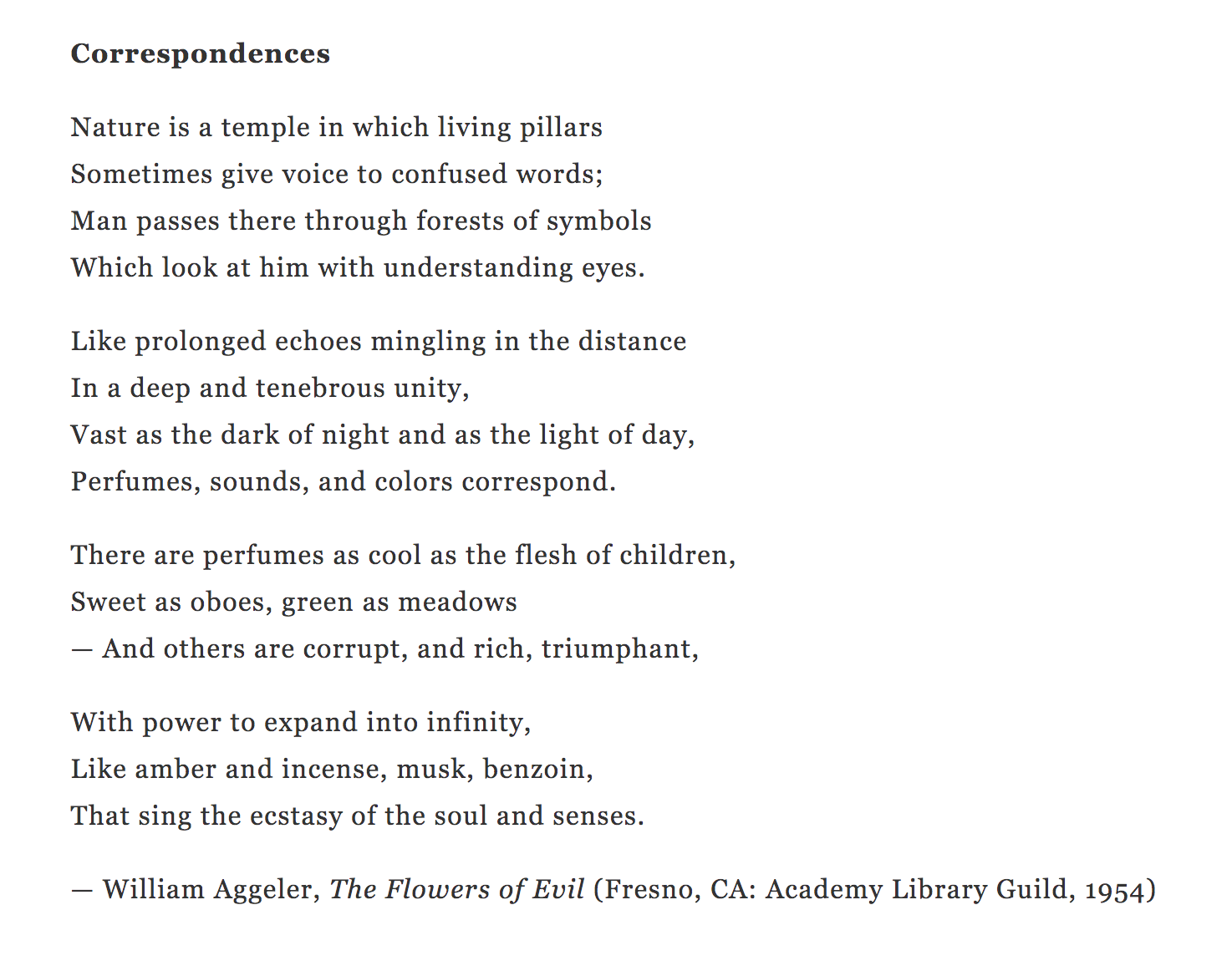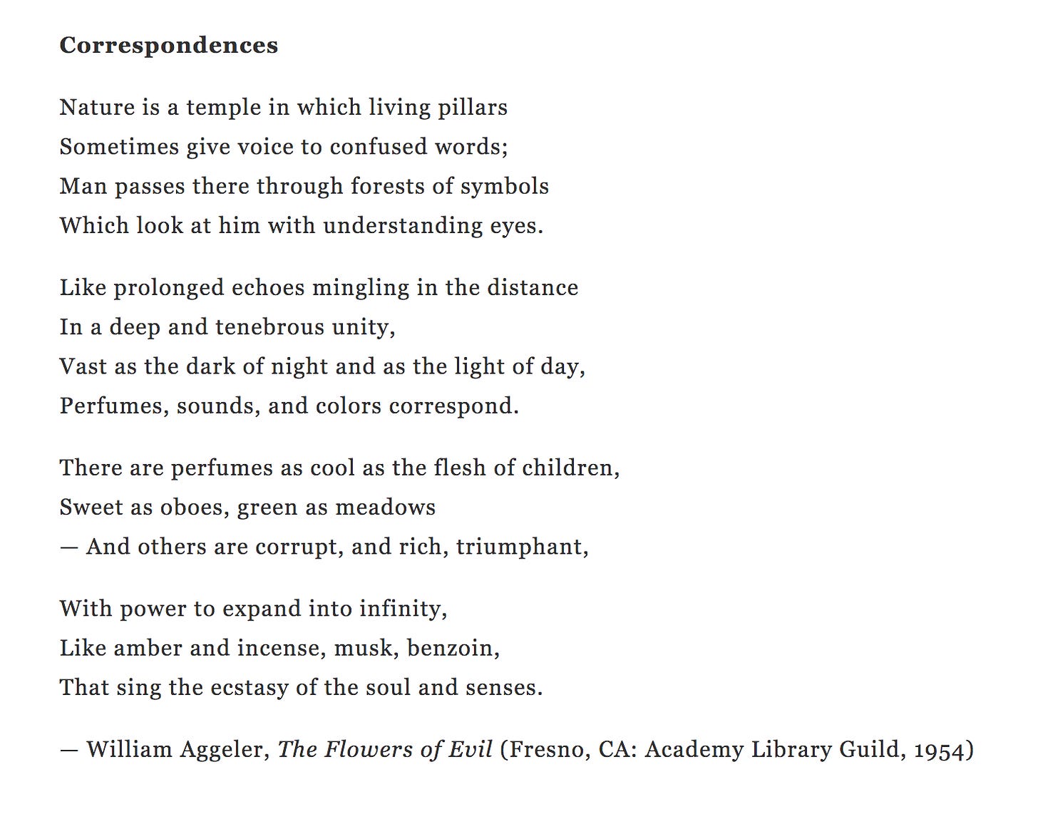 Correspondances is one of those poems that makes my heart hum toward the page with a desire to know, to inhabit, to be surrounded by words and unfamiliar spaces Whether that surrounding is an embrace or a crushing anaconda I do not know. I guess the translation that’s acceptable to me is the familiar one, the most literal one.