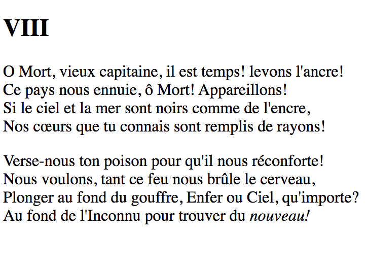I think about Baudelaire’s last stanza of The Voyage. I wish I could fully embrace it but I hold back, like I wish I could charge full force into the thunder of Beethoven’s 9th blasting along without remorse and without acceptance. Baudelaire trips us here and we lose our balance, find ourselves leaping shrieking joyfully into this cataclysmic orgasmic end: