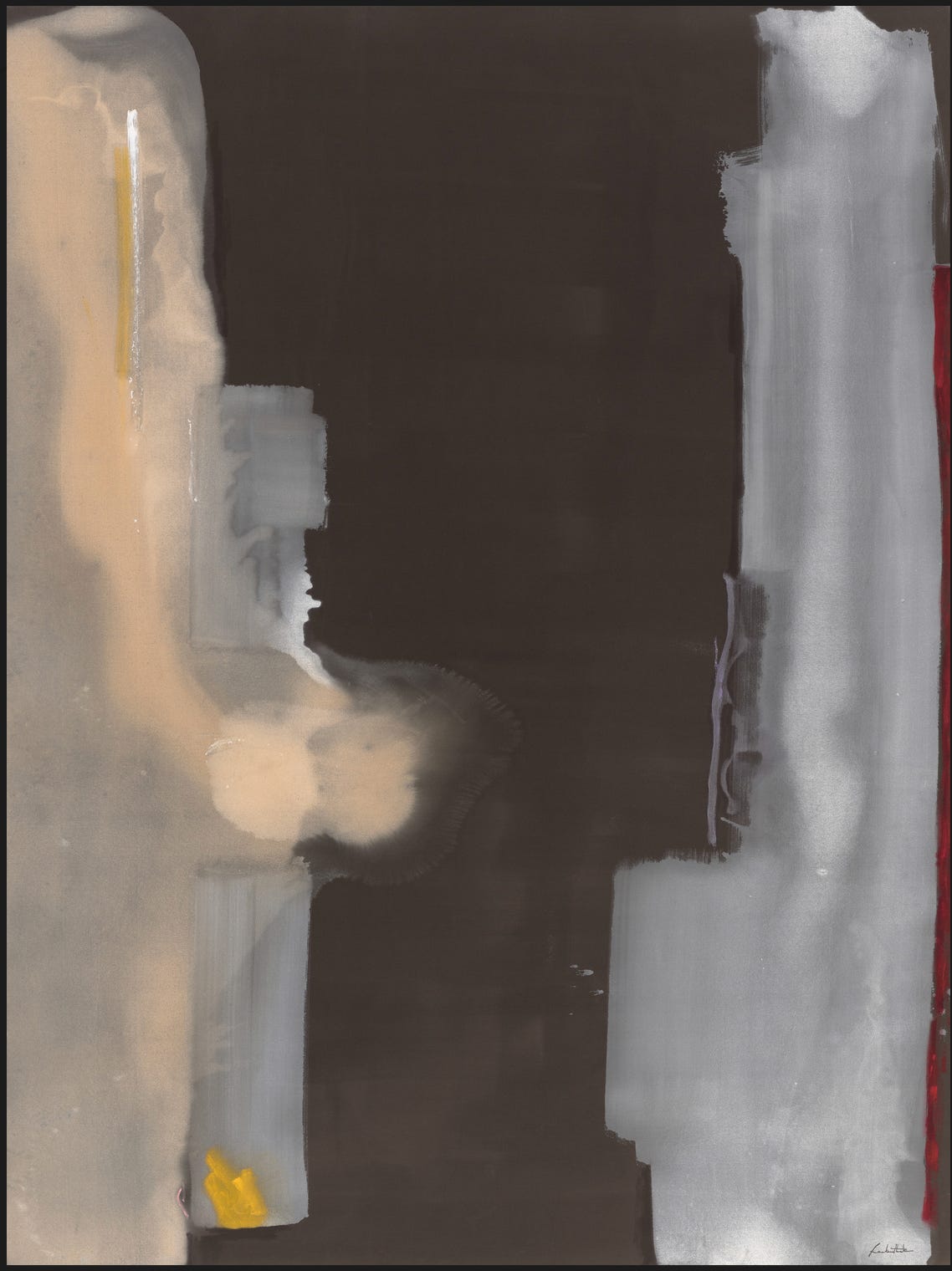 I found myself standing for a long time in front of one enormous, vertical painting. Mostly dark gray in the middle, some lighter grays on the edges; a hint of yellow in the right places and a more thickly applied sliver of red most of the way down the right side. The center impassive; neither void nor surface. I thought to myself this is the hand of experience. this is made by a confident hand. I felt the self-knowledge and expertise, the work and knowlege of “what works” and the balance between contingency and control. It felt settled and searching at the same time, like an in-breath held until the right moment. Experience, practice, self-awareness.
